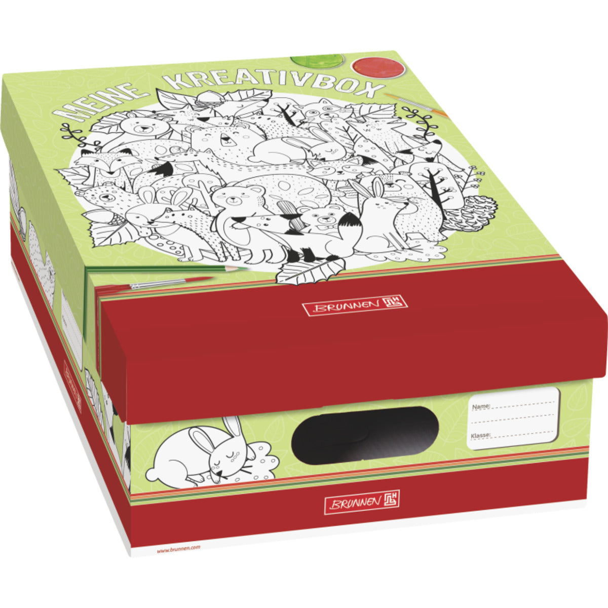Die Brunnen Bastelbox Kreativ-Box ist eine stabile Aufbewahrungsbox aus Karton, die speziell für die Organisation von Schul-, Mal- und Bastelutensilien entwickelt wurde. Mit ihren Maßen von etwa 31 × 22 × 9,5 cm bietet sie ausreichend Platz für Farbkasten, Pinsel, Stifte, Schere, Kleber oder andere kreative Materialien. Der abnehmbare Stülpdeckel ist mit einem Ausmalmotiv versehen, das individuell gestaltet werden kann, und besitzt zusätzlich ein Namensfeld, um Verwechslungen zu vermeiden. Die Box wird flach geliefert und lässt sich leicht zusammenbauen. Sie eignet sich ideal für den Einsatz in Schule und Freizeit und ist je nach Anbieter in Deutschland für etwa drei bis sieben Euro erhältlich.