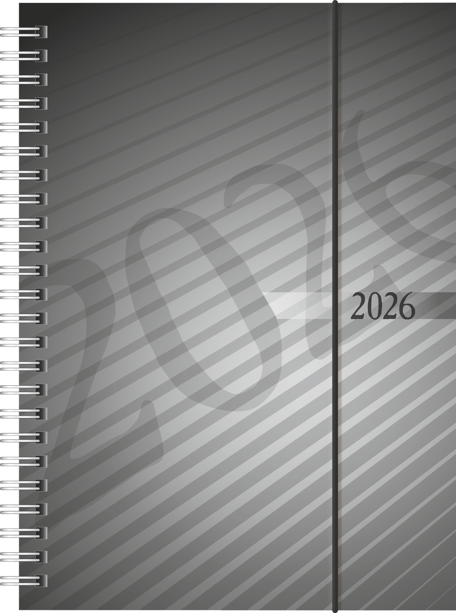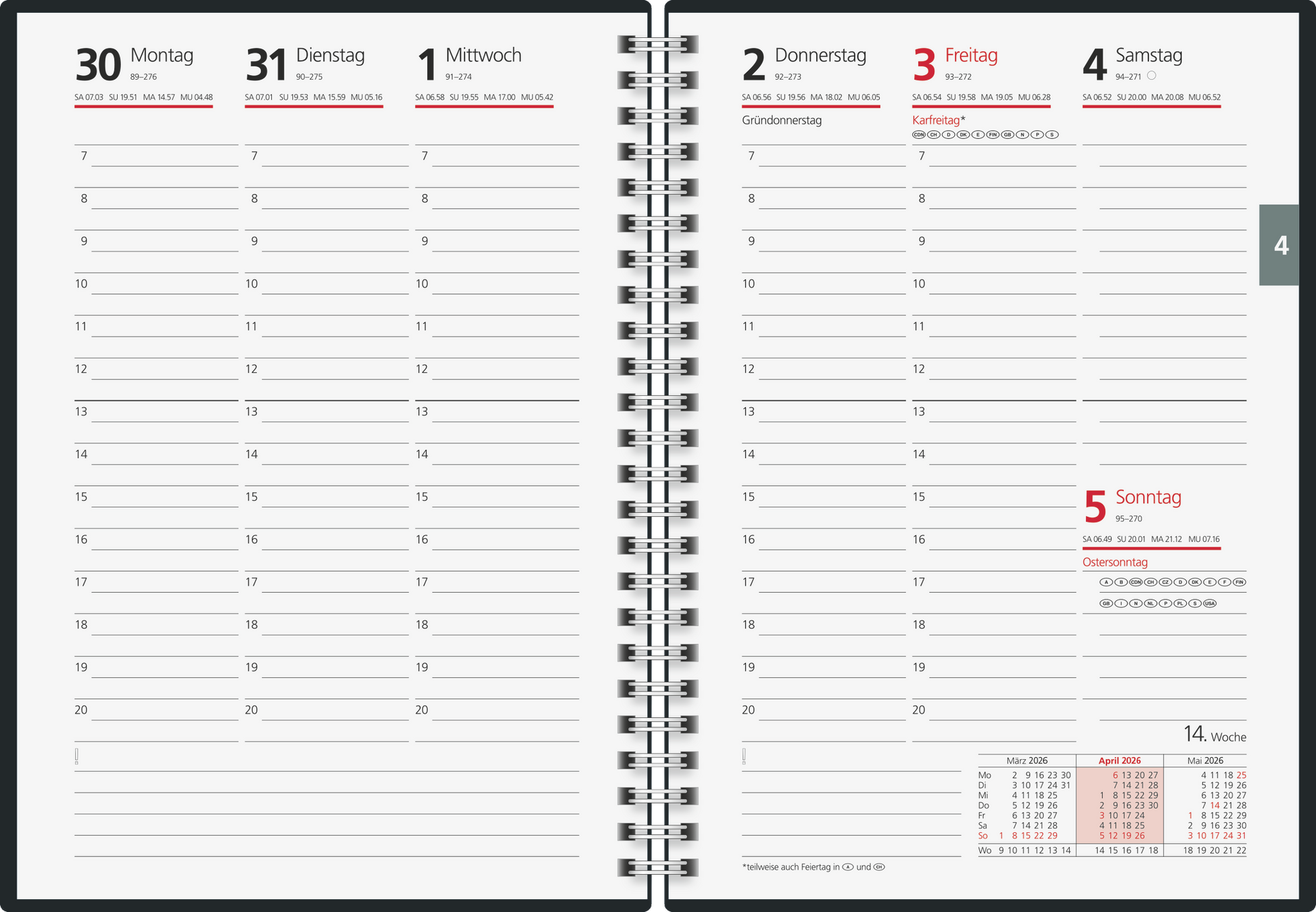 Blattgröße: 148×208 mm 2 Seiten = 1 Woche, halbstündliche Einteilung von 7-20 Uhr, nicht Sa. und So. 160 Seiten, Druckfarbe Kalendarium: grau/rot 80 g/m², Wire-O-Bindung PP-Einband, Farbe: anthrazit, Gummizugverschluss Jahresübersicht aktuelles Jahr und Folgejahr, 6 Seiten Monatsplan aktuelles Jahr, 6 Seiten Folgejahr, Ferientermine Deutschland, 1 Seite Notizen liniert, 16 Seiten blanko, 11 Seiten Wissenswertes, 8 Seiten Adressen für Kalenderjahr 2026