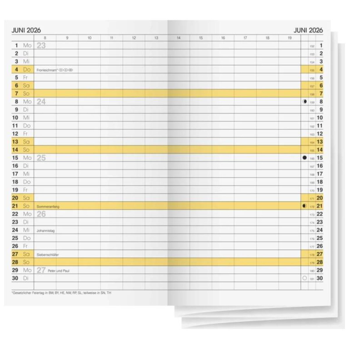 Blattgröße: 87×153 mm 2 Seiten = 1 Monat, Stundeneinteilung von 8-19 Uhr Druckfarbe Kalendarium: schwarz/gelb 100 g/m², Leporello-Falz, 15-teilig Kalendarium: Oktober Vorjahr bis März Folgejahr, Kalendarium 15-teilig Jahresübersicht Vorjahr, aktuelles Jahr und Folgejahr, Ferientermine Deutschland für Kalenderjahr 2026