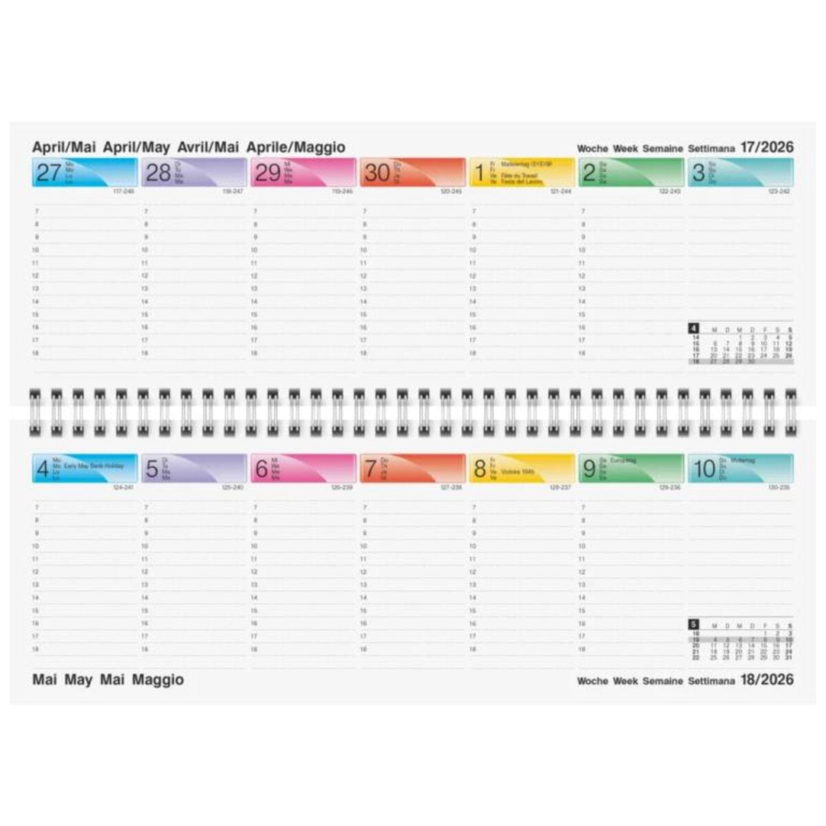Blattgröße: 297×105 mm 1 Seite = 1 Woche, Stundeneinteilung von 7-18 Uhr 96 Seiten, Druckfarbe Kalendarium: bunt 80 g/m², Wire-O-Bindung Kalendarium: Juli 2025 bis Dezember 2026 viersprachig: deutsch, englisch, französisch, italienisch Karton-Umschlag, Farbe: blau 2 Seiten Monatsplan aktuelles Jahr, 2 Seiten Folgejahr, Ferientermine Deutschland und Österreich für Kalenderjahr 2026