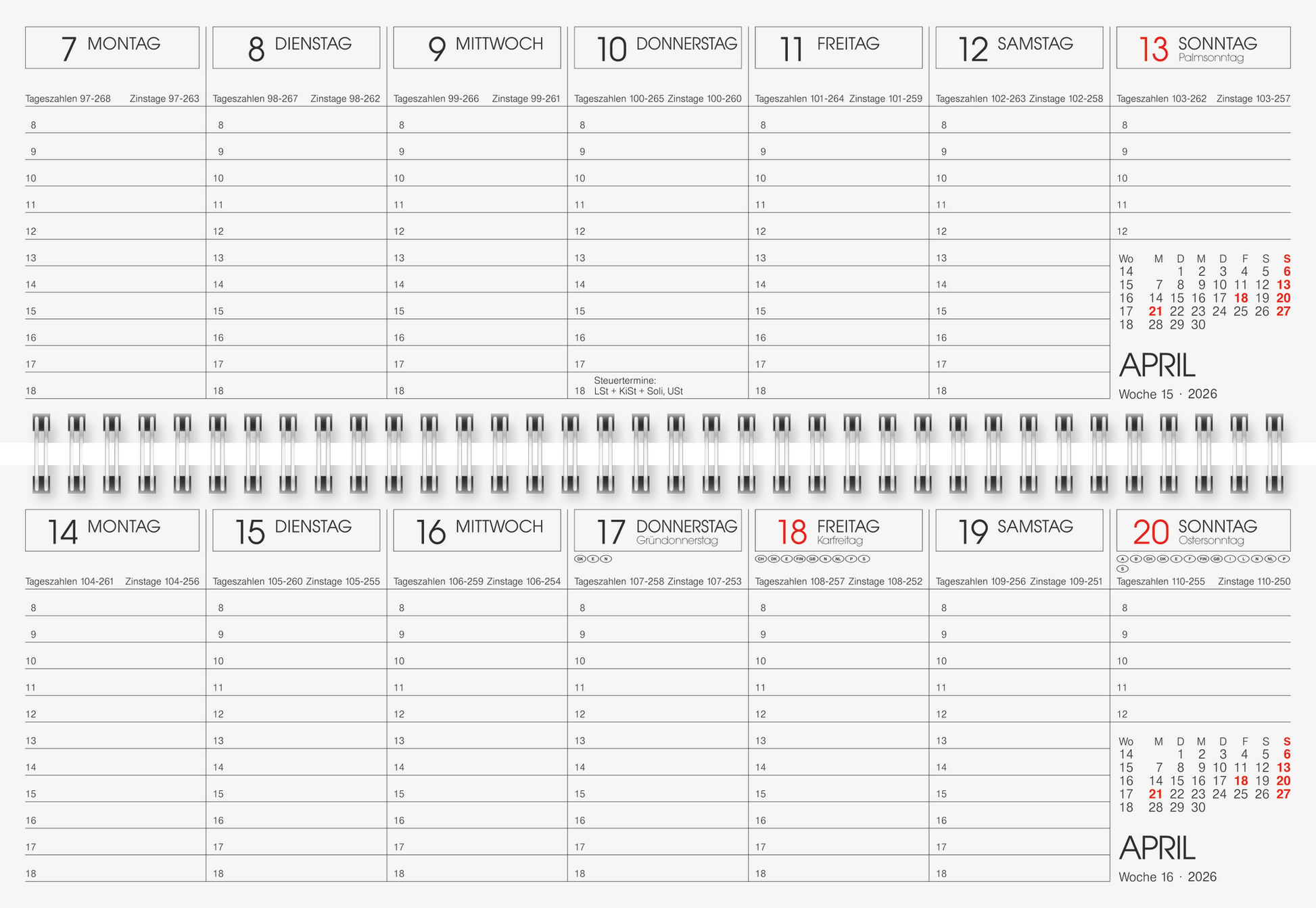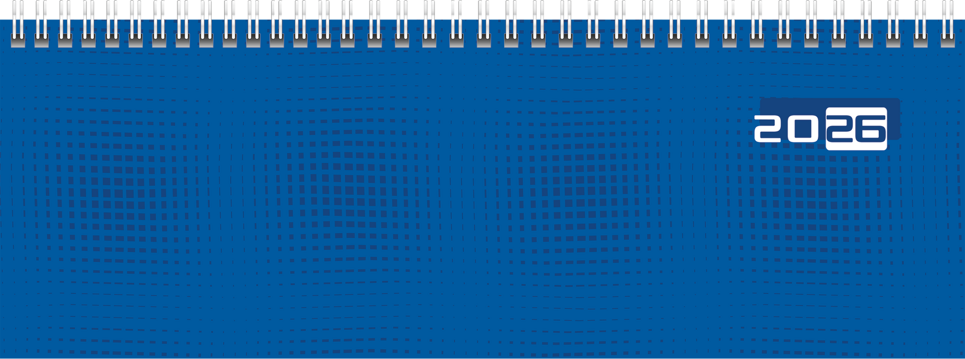 Blattgröße: 297×105 mm 1 Seite = 1 Woche, Stundeneinteilung von 8-18 Uhr, So. 8-12 Uhr 64 Seiten, Druckfarbe Kalendarium: schwarz/rot 70 g/m², Wire-O-Bindung Karton-Umschlag, Farbe: blau Jahresübersicht aktuelles Jahr und Folgejahr, 1 Seiten Monatsplan Januar bis Juni Folgejahr, Ferientermine Deutschland, 1 Seite Ferientermine für Kalenderjahr 2026
