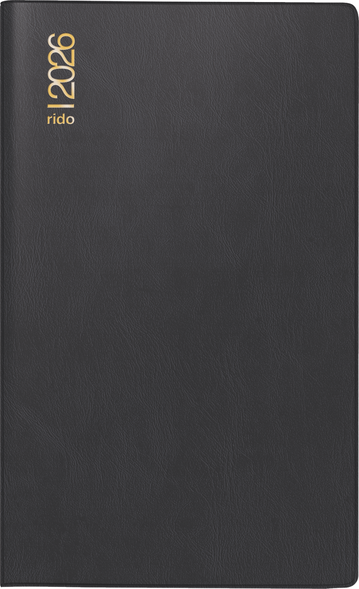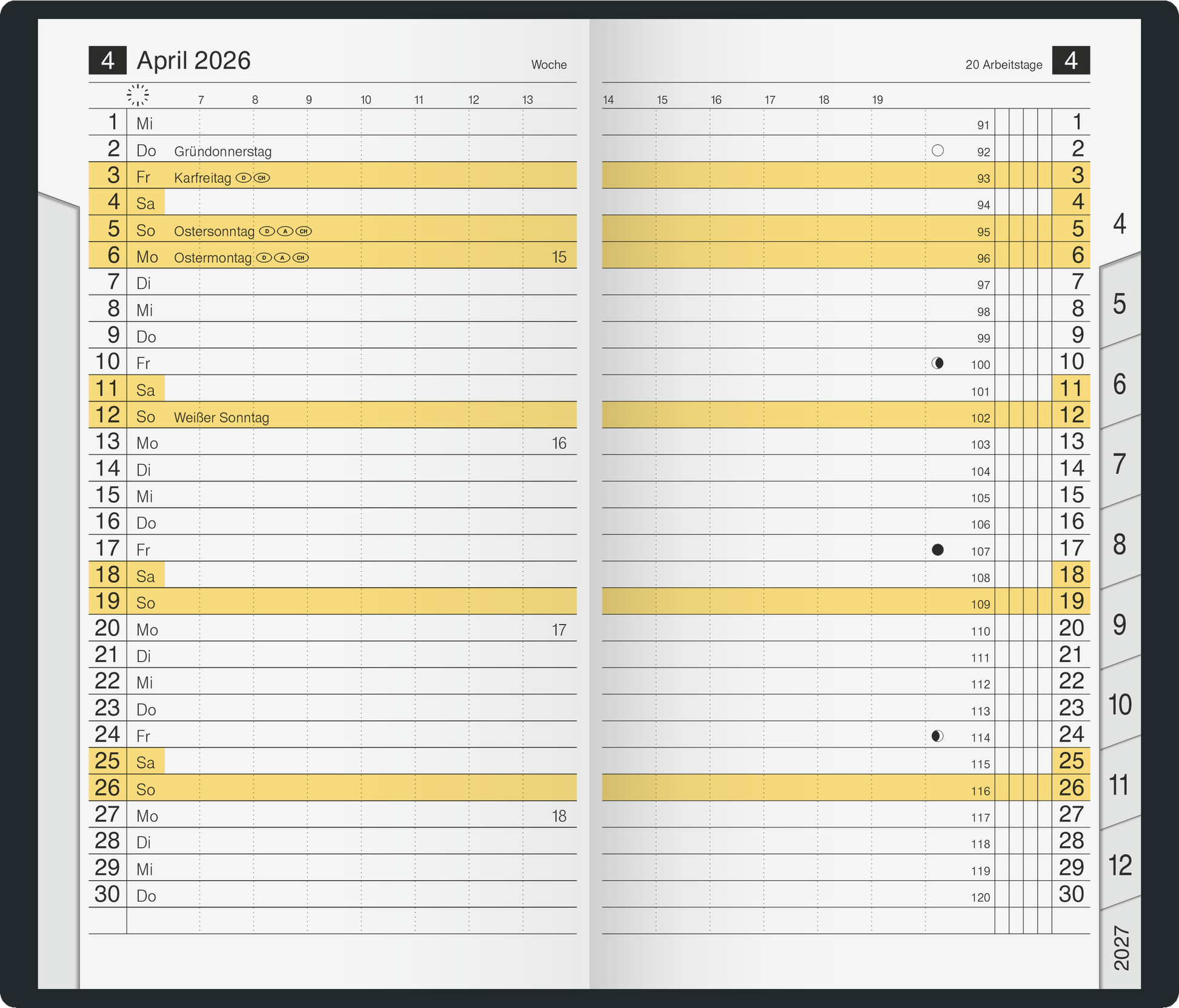 Blattgröße: 87×153 mm 2 Seiten = 1 Monat, Stundeneinteilung von 7-19 Uhr 32 Seiten, Druckfarbe Kalendarium: grau/gelb 80 g/m², Drahtheftung Kunststoff-Einband, Farbe: schwarz Monatsregisterschnitt Jahresübersicht aktuelles Jahr und Folgejahr, 2 Seiten Monatsplan November/Dezember Vorjahr, 3 Seiten Januar bis Mai Folgejahr, Ferientermine Deutschland, 16 Seiten Adressen, auswechselbar Kalendereinlage auswechselbar für Kalenderjahr 2026