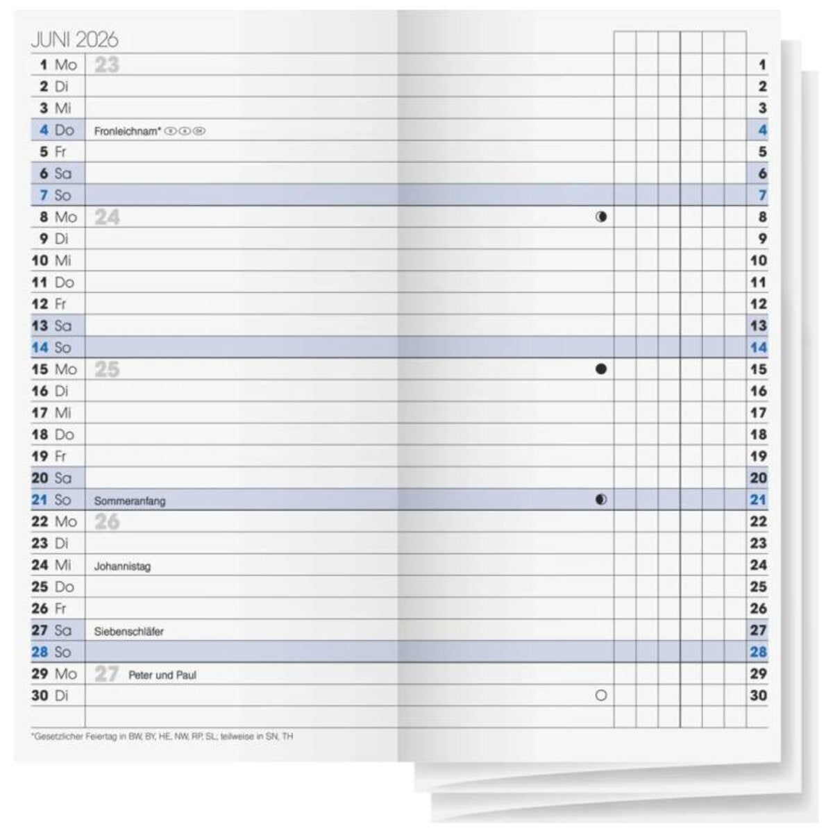 Blattgröße: 78×153 mm 2 Seiten = 1 Monat Druckfarbe Kalendarium: schwarz/blau 100 g/m², Leporello-Falz, 13-teilig Kalendarium: Januar bis Dezember Ferientermine Deutschland für Kalenderjahr 2026