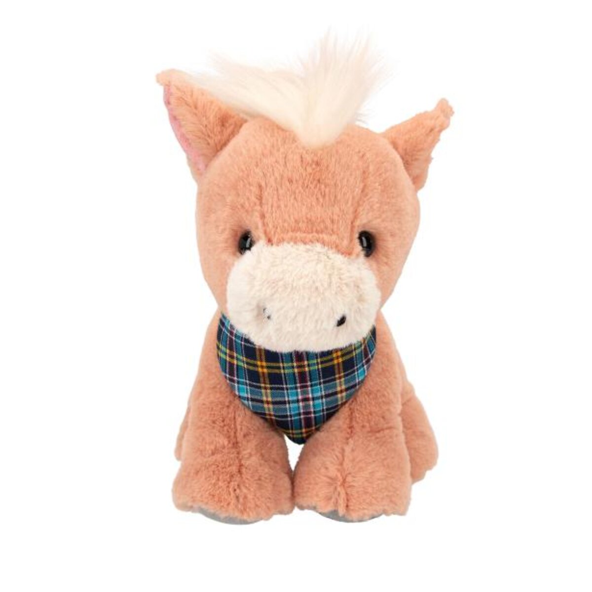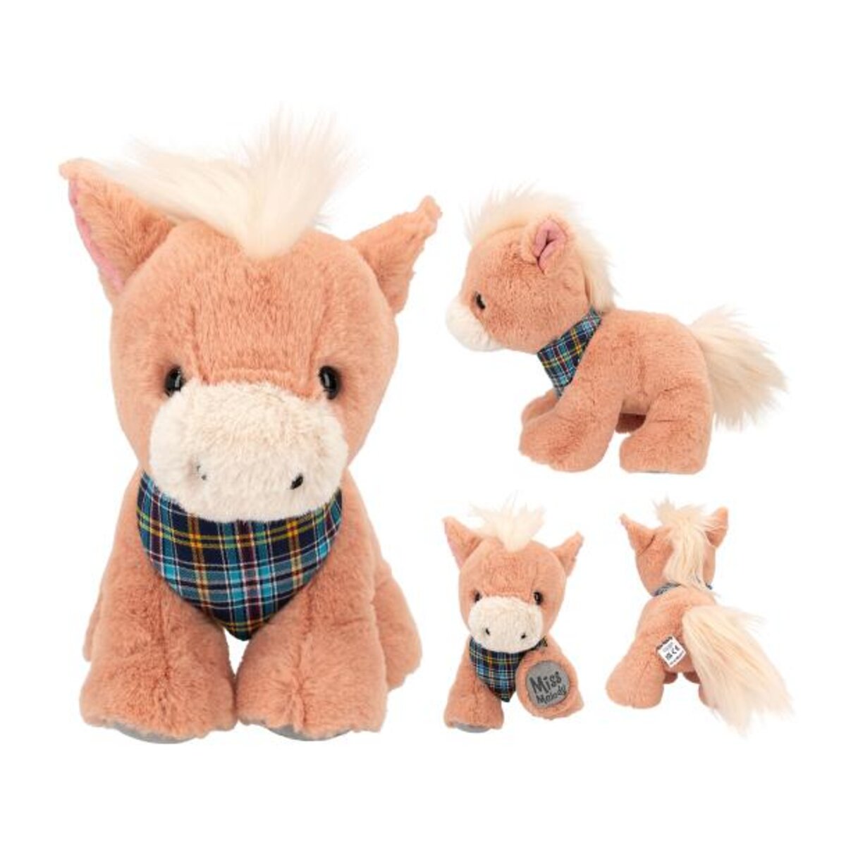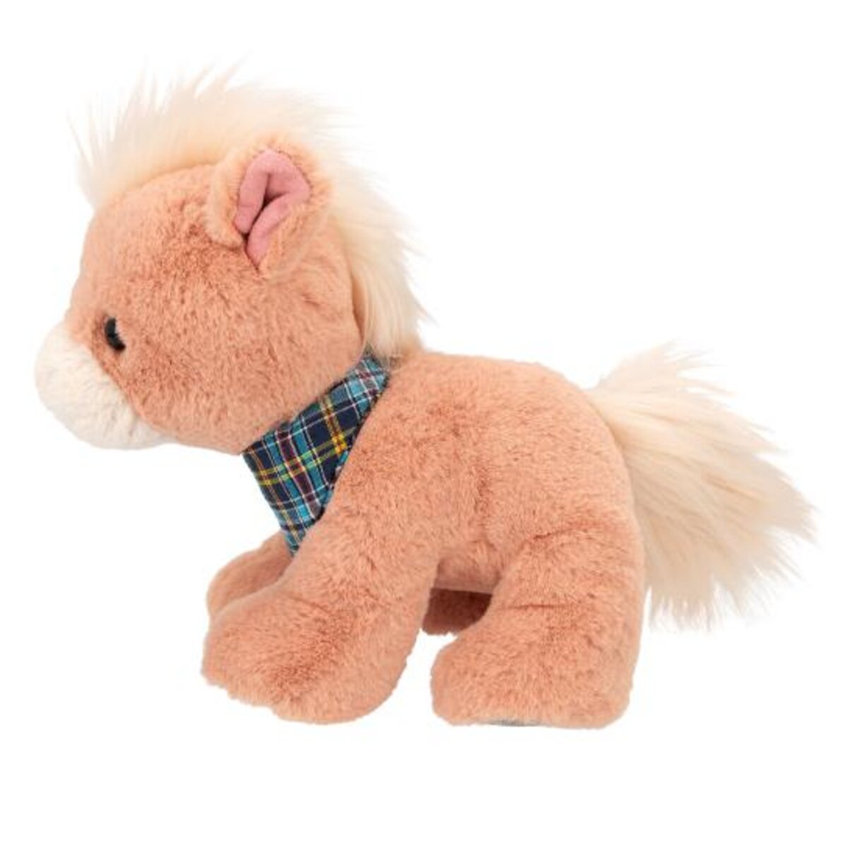 Das superniedliche und noch flauschigere hellbraune Plüschpferd von Miss Melody mit cremeweißer Mähne trägt ein kleines mehrfarbig kariertes Halstuch. Ohren und Hufe sind dunkelgrau. Maße und Material: 20 cm; 100 Prozent Polyester