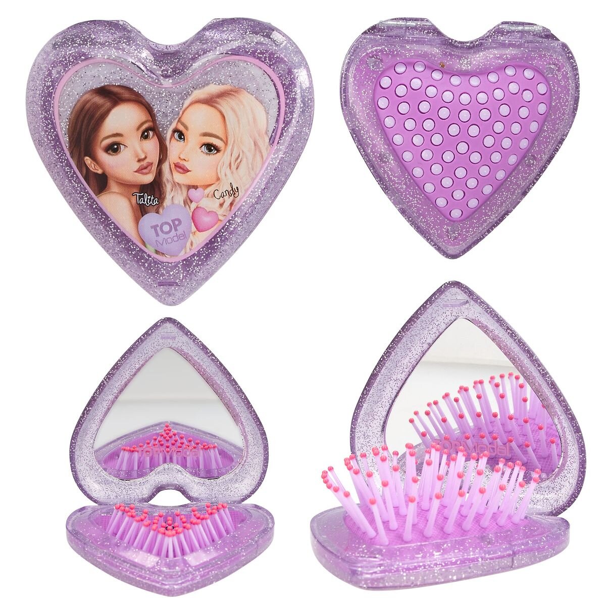 Aufklappen, umstülpen, kämmen: Die TOPModel-Klapphaarbürsten in handlicher Herzform gibt es in transparentem Rosa und Lila. Beide mit tollem silbernem Glitzer und einem hüsbchen Doppel-Modelmotiv auf der Front. Innen mit einem kleinen Spiegel, ebenfalls in Herzform.