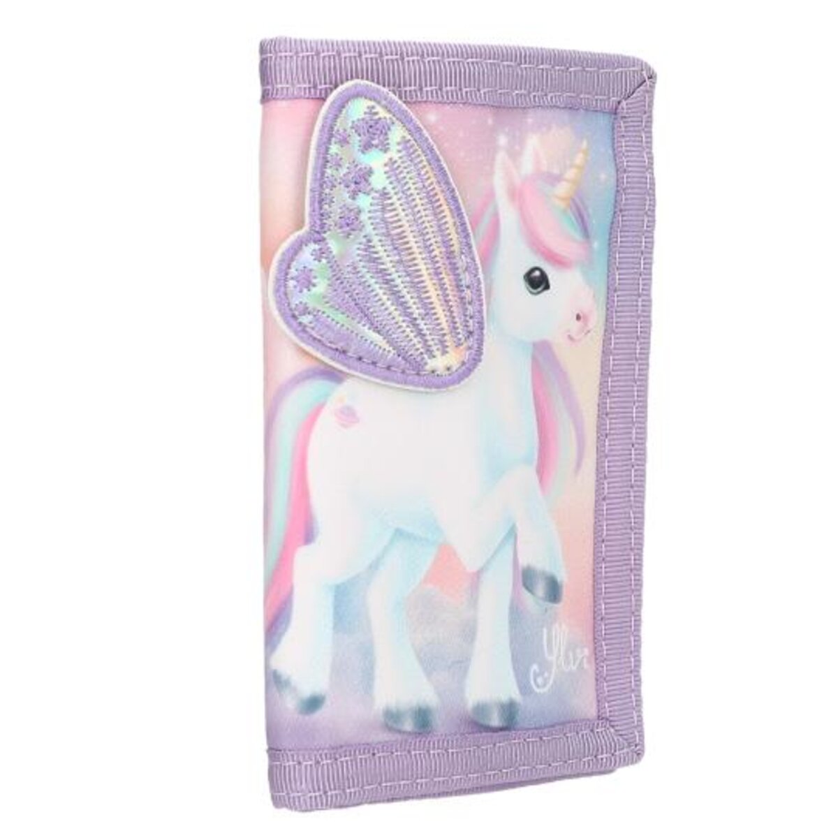 Einzigartig einhorntastisch! Das lilafarbene Portemonnaie von Ylvi hat auf der Front ein supersüßes Einhorn mit einem applizierten, gesteppten Flügel aus schimmerndem Holo-Material. Innen mit Geldscheinfach, Kartenfächern, transparentem Namenskartenfach und Schlüsselring. Außen mit Reißverschlussfach für Münzen. Das Portemonnaie schließt mit einem Klettverschluss. Hauptmaterialien: PES, Polyester