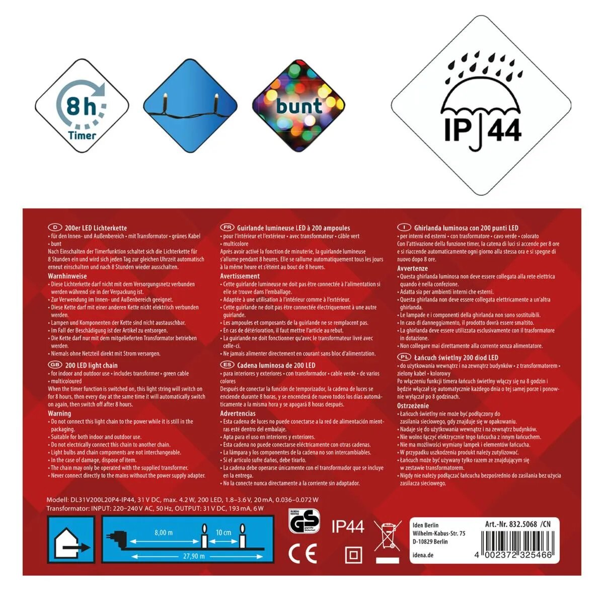 Idena LED Lichterkette 200er, bunt, innen und außen