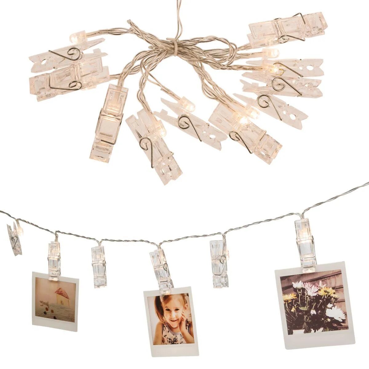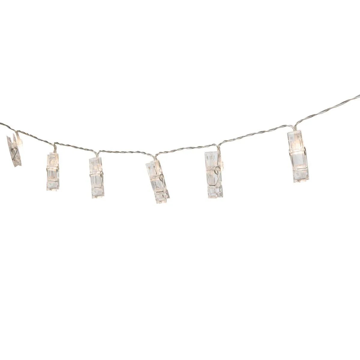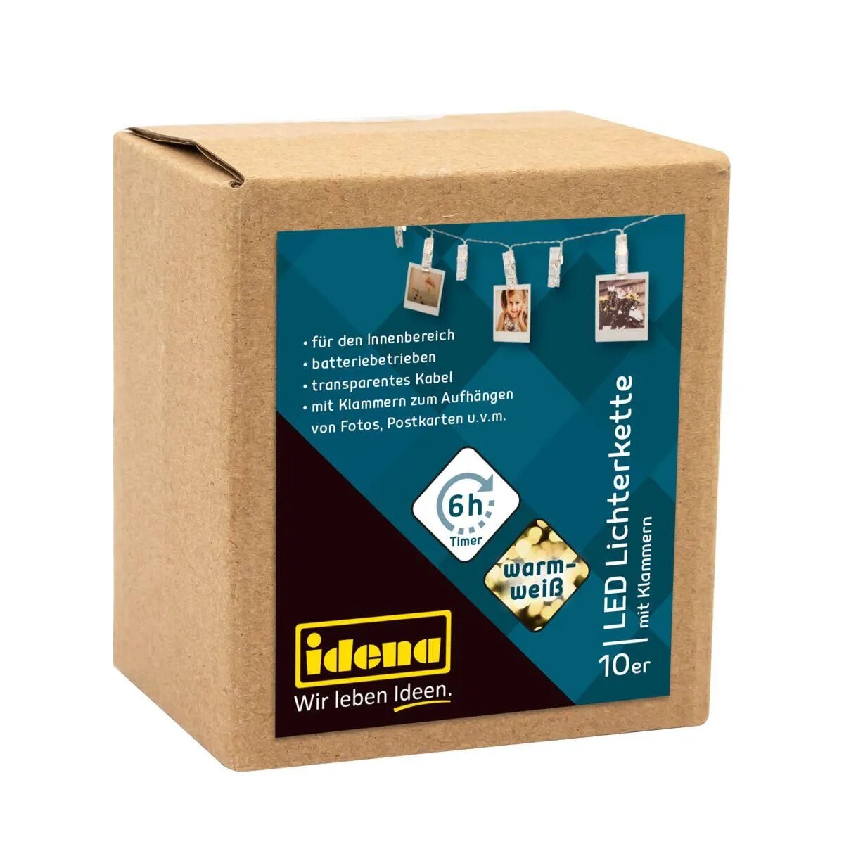 Die Idena Lichterkette mit 10 warmweißen LED in Form von transparenten Wäscheklammern ist die passende Dekoration für das ganze Jahr. An die Klammern können Sie Ihre liebsten Fotos, Postkarten etc. aufhängen, um sie so richtig schön in Szene zu setzen. Die Lichterkette ist ca. 1,40 m lang, davon sind ca. 50 cm Zuleitung und der Lampenabstand beträgt ca. 10 cm. Die Lichterkette wird mit 2 AA Batterien betrieben und ist mit einem Timer ausgestattet. Aktiviert man den Timer, so schaltet sich die Kette jeden Tag zur gleichen Zeit ein und leuchtet dann für 6 Stunden. Setzen Sie die Idena LED Lichterkette mit Ihren kreativen Ideen geschickt in Szene. Die Marke Idena hat sich im Schreib- und Spielwarenmarkt fest etabliert und überzeugt durch große Produktvielfalt. Das Markenversprechen "Wir leben Ideen." spiegelt sich inzwischen in über 1400 Artikeln wider.
