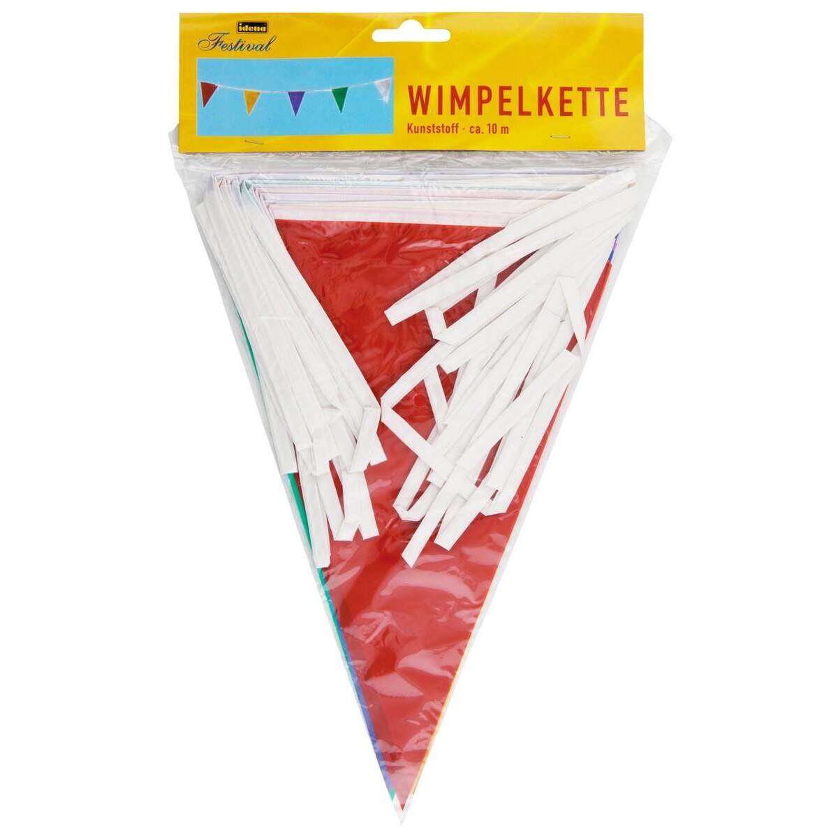 Eine Wimpelkette bringt Farbe und feierliche Stimmung in jedes Wohnzimmer, jeden Garten und in jeden dunklen Partykeller. Die Dekorationskette mit den bunten Wimpel-Fähnchen in den Farben Rot, Gelb, Lila, Grün und Weiß kann überall im Innen- & Außenbereich aufgehängt werden. Die 10 m lange Wimpelkette besteht aus Kunststoff und ist wiederverwendbar. Die Fähnchen sind ein hübsches Dekorations-Accessoire für das ganze Jahr.