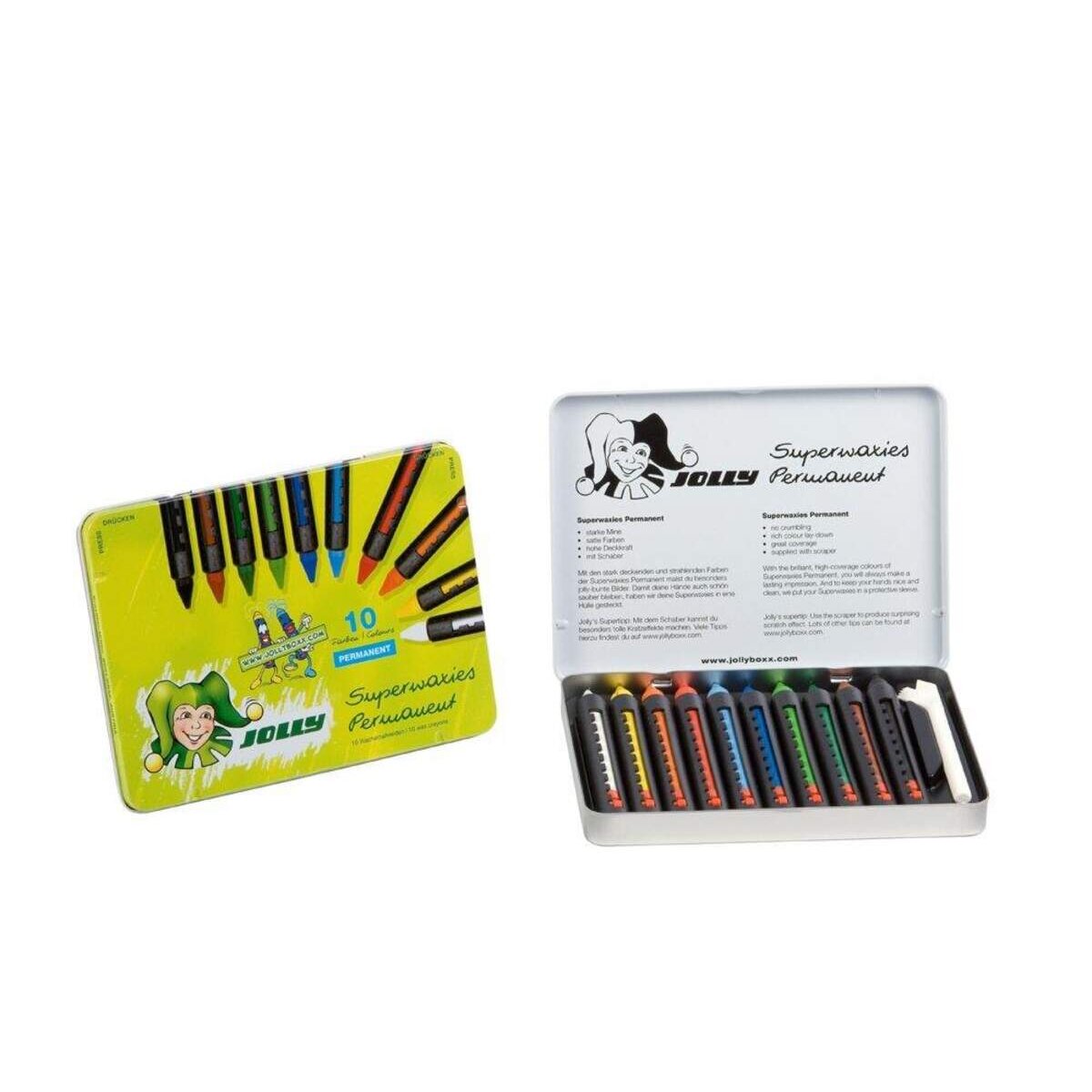 Die Superwaxies Classic von Jolly bieten hohe Deckkraft und leuchtende Farben. Sie sind der Klassiker unter den Wachsmalkreiden. Die Kunststoff-Hülse sorgt für sicheren Halt. Der Artikel enthält 10 Wachsmalkreiden und einen Kratzer, verpackt im 3D-Metalletui.