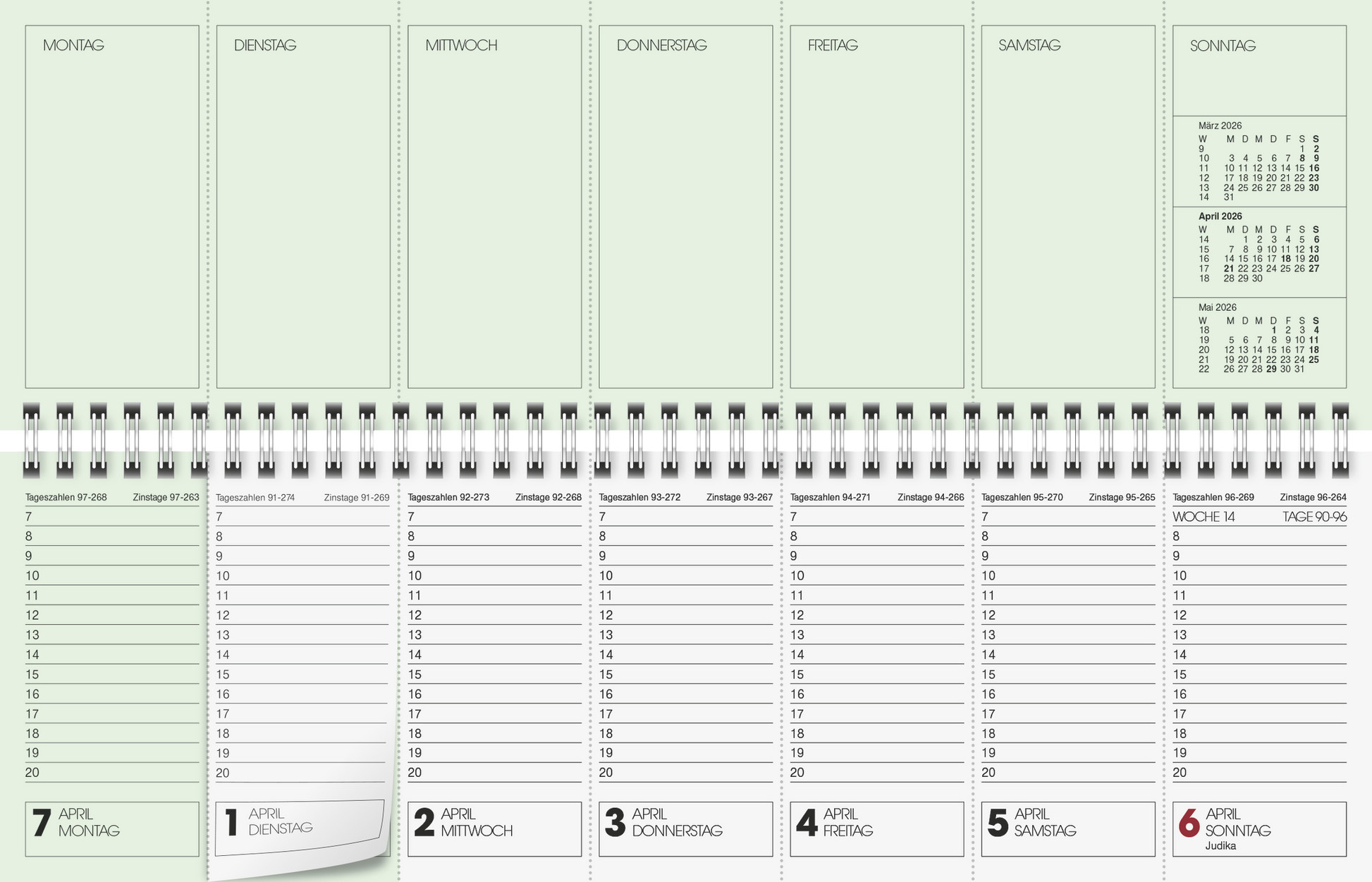 - Papierfarbe in wöchentlichem Wechsel grün/weiß, tageweise perforiert