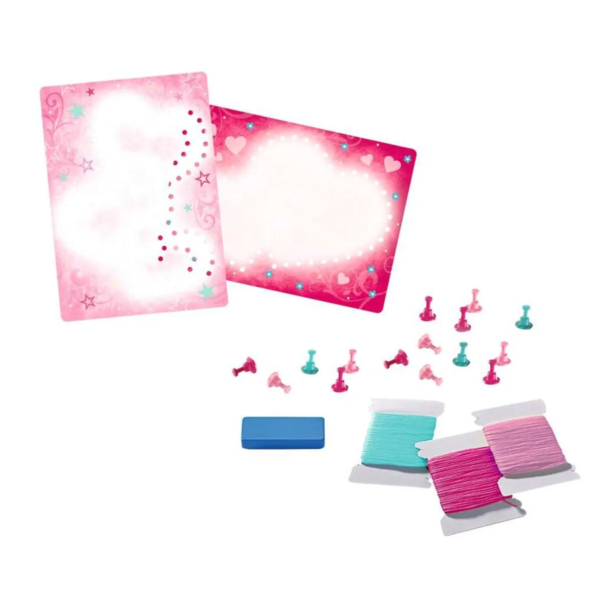 Mit dem Ravensburger BeCreative Set String Art Hearts erlernen bereits Kinder ab 6 Jahren die beliebte Technik String Art. Hier werden keine Nägel eingeschlagen, sondern Kunststoffpins eingedrückt. Sind alle Pins gesteckt, werden auf der Vorderseite der Tafel die bunten Fäden ganz nach Belieben kreuz und quer gespannt, bis das Fadengeflecht das Motiv erscheinen lässt. Wann das Fadenbild fertig ist, entscheidet jeder selbst. String Art ist wieder voll im Trend. Mit dem Ravensburger String Art-Set erlernen bereits Grundschulkinder die beliebte Technik. Das geht ganz einfach: Die Löcher der Motivtafeln sind auf der Rückseite farbig umrandet. So ist ganz leicht zu erkennen, welcher Pin an welche Position kommen soll. Sind alle Pins gesteckt, werden auf der Vorderseite der Tafel die farblich passenden Fäden ganz nach Belieben kreuz und quer gespannt, bis das Fadengeflecht das Motiv erscheinen lässt. Wann das Bild fertig ist, entscheidet jeder selbst. Das Netz kann dabei ganz dicht sein oder auch mit vielen Zwischenräumen. Im Set enthalten sind Kunststoffpins in unterschiedlichen Farben, zwei Motivtafeln mit Vorlage sowie Garn auf Haspeln in verschiedenen Farben.