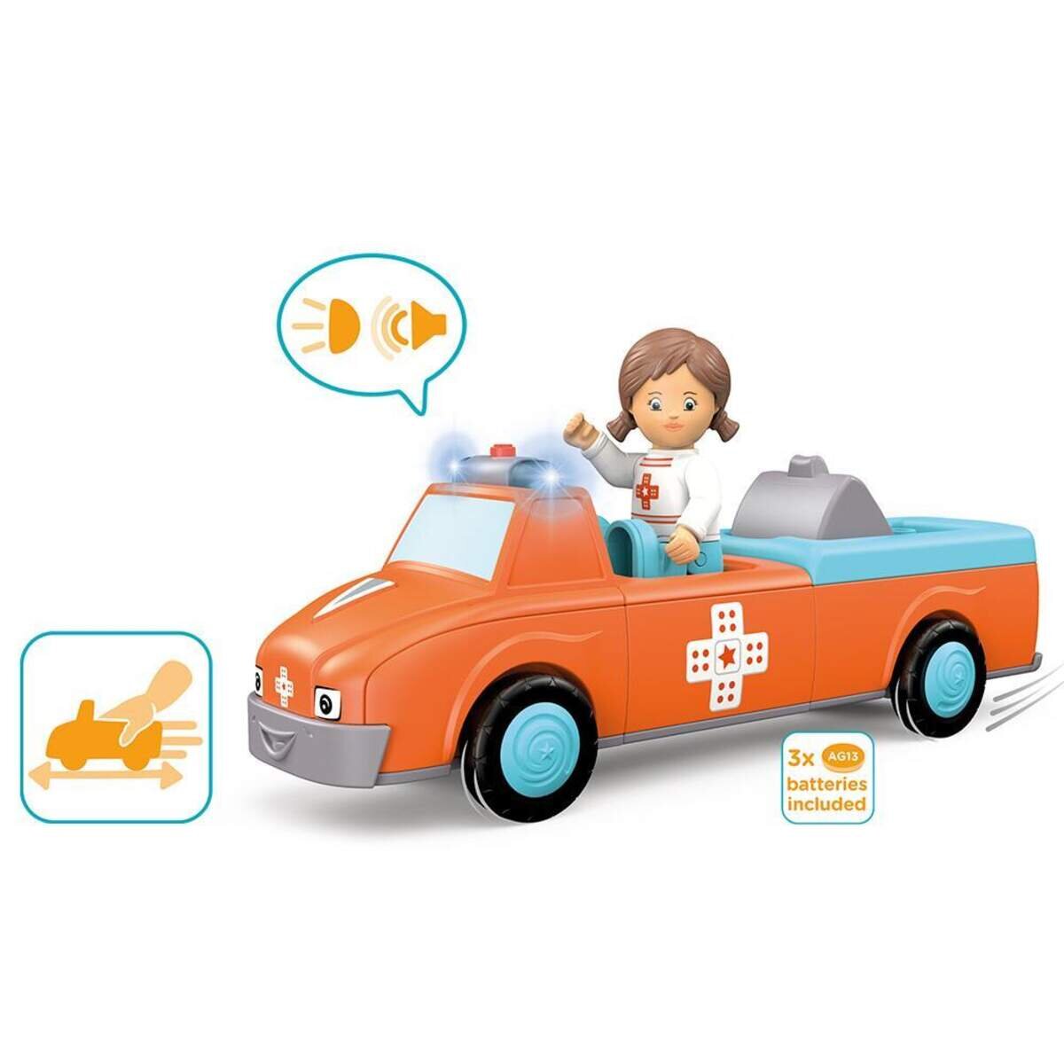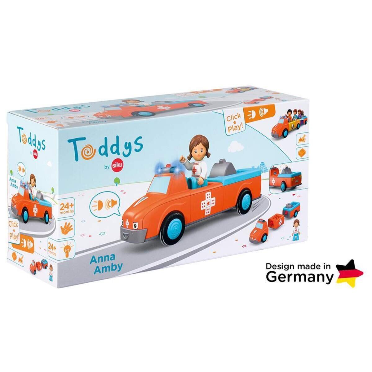 Wenn Anna und Ambys Notfalltelefon klingelt, braucht jemand dringend ihre Hilfe! Anna schaltet das Martinshorn ein und die signalrote Amby flitzt mit blinkendem Blaulicht los zur Unfallstelle. Vor Ort untersucht Anna den Kranken und beginnt sogleich mit der Erst-versorgung. Oft kann Anna hier schon viel helfen und die Schmerzen sind bald vergessen. Danach legt sie den Patienten auf Ambys super weiche Liege. Dank der verstellbaren Rückenlehne ist ein Transport im Sitzen oder Liegen möglich. Nun sitzt Anna wieder auf dem Fahrersitz und die drei steuern das nächste Krankenhaus an. Wenn sie ihren Patienten abgeliefert haben, machen sich Anna und Amby sogleich wieder bereit für ihren nächsten Einsatz. Spannendes, hochwertiges Spielzeug für Kinder ab 24 Monaten mit Friktionsmotor (Schwungradmotor) zur Förderung der Feinmotorik, Ausdauer, Geduld und zum Spaß haben. Die Spielfigur Anna ist beweglich: Der Kopf lässt sich drehen, die Arme lassen sich heben und die Beine können angewinkelt werden. Das Fahrzeug Amby lässt sich in drei Teile zerlegen und mit weiteren Toddys-Fahrzeugen kombinieren. Licht- und Soundeffekte zur Unterstützung der Fahrzeugcharakteristik. Das Kissen der Liegefläche kann hoch- und runtergeklappt werden, sodass die Figur liegend oder sitzend transportiert werden kann. Anna Amby ist kompatibel mit Bausteinen anderer Hersteller.siku-„Click&Play“-System: Einfaches Kombinieren durch Dreh-Steck-System der Fahrzeugteile zur Förderung der motorischen Fähigkeiten und für langanhaltenden Spielspaß. Robuste Verarbeitung in siku-Qualität