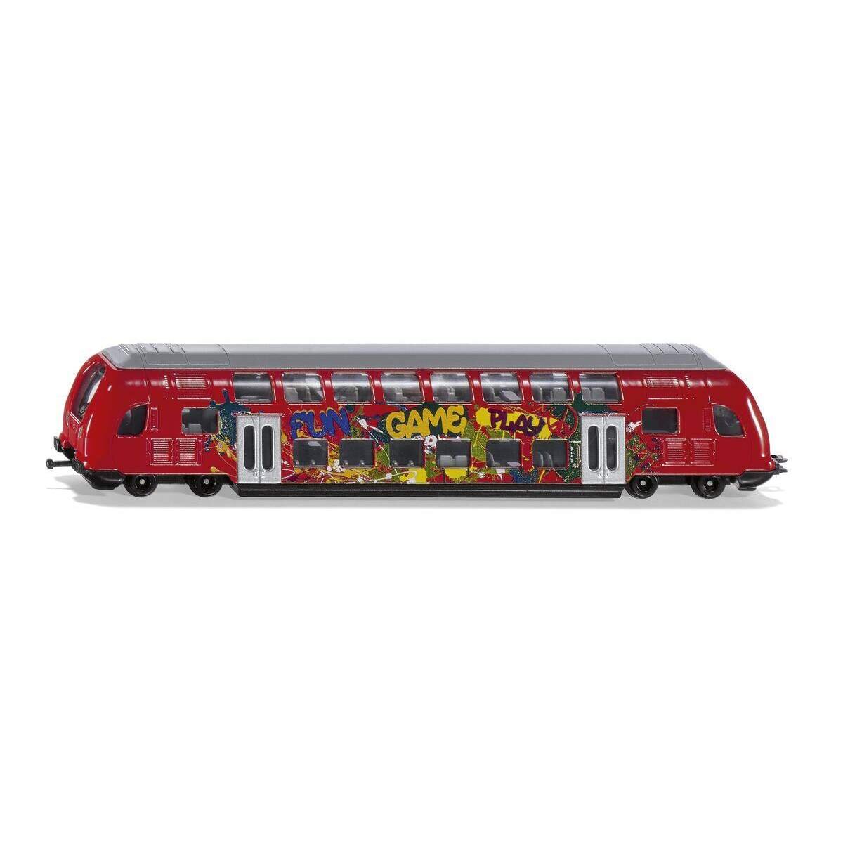Ein in flippigem Layout gestalteter Doppelstock-Zug fährt zügig in das SIKU-Sortiment ein. Der weitgehend aus Metall gefertigte Zug mit zwei Sitzebenen fährt auf glatt laufenden Rädern und ist an Front und Heck mit den Standardkupplungen für SIKU-Modellzüge ausgestattet. Somit kann dieser Zug problemlos verlängert werden.