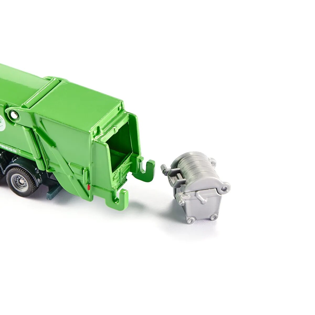 Entsorgungsfahrzeug der Marke Faun auf Basis eines Scania R-Fahrerhauses. 3-Achs-Fahrgestell mit einem Müllbehälter-Aufbau neuester Designentwicklung. Eine coole Bedruckung und die zu öffnende Ladevorrichtung am Heck runden das Bild dieses ansprechenden M