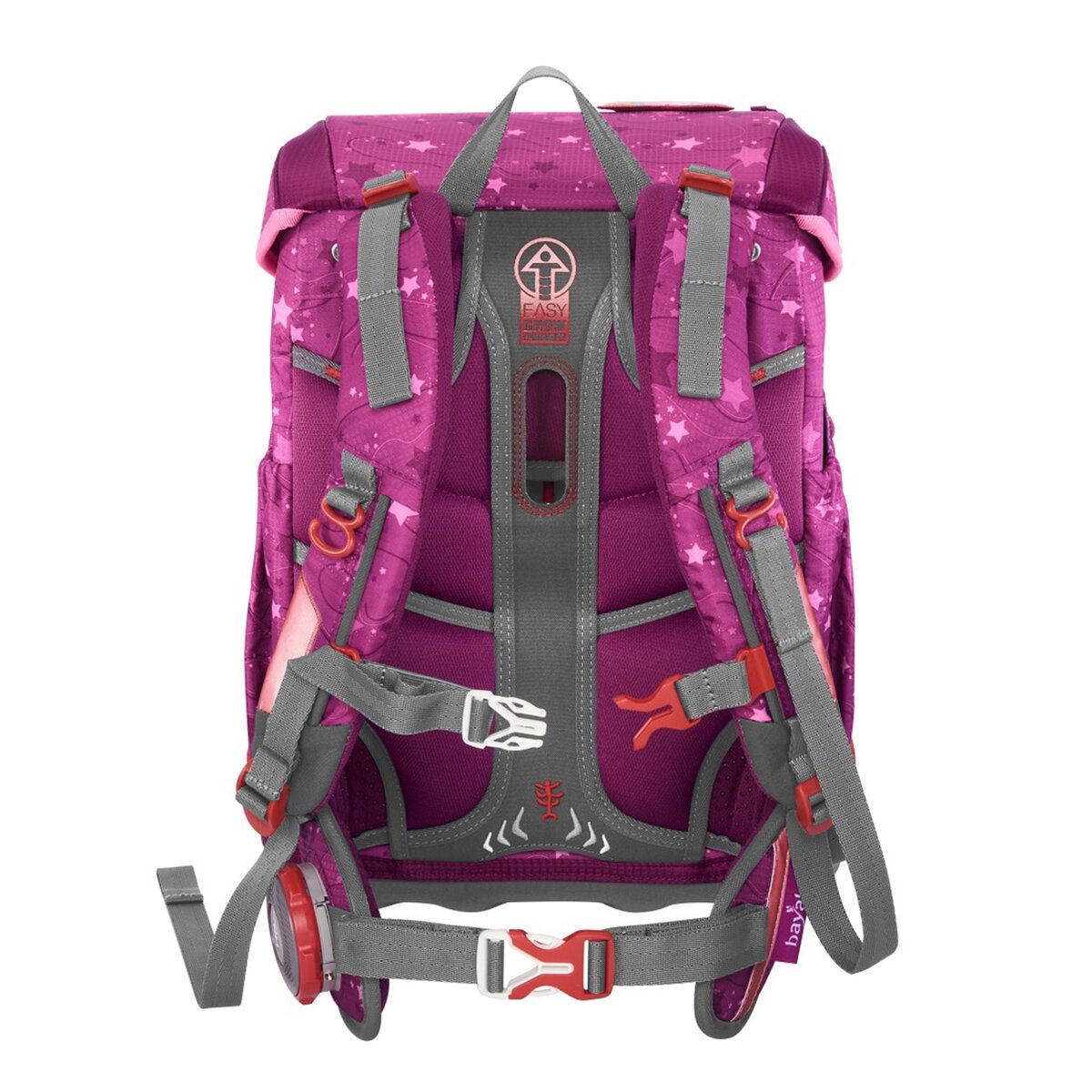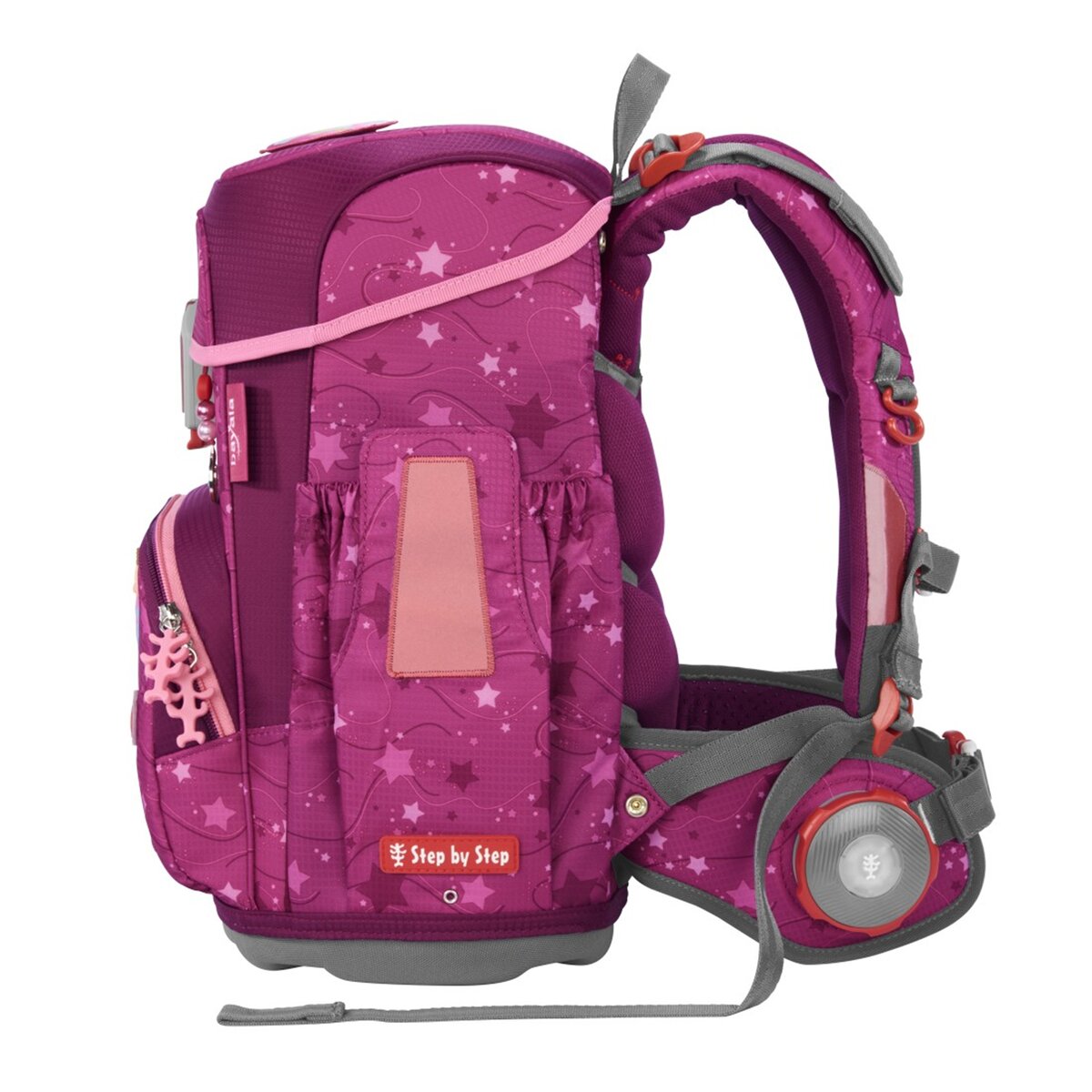 Tragekomfort/Ergonomie Ultraleichte Rückenkonstruktion aus Fieberglas Anatomisch geformte Schulterträger, höhenverstellbar (EASY GROW SYSTEM) Lageverstellriemen Höhenverstellbarer, abnehmbarer Brustgurt Abnehmbarer Hüftgurt Ergonomisch geformte Rückenpartie Atmungsaktives Rückenpolster Verstaumöglichkeiten Hauptfach mit integriertem Bücherfach Nach außen wachsende Vordertasche mit Auslaufösen Zwei offene, nach außen wachsende Seitentasche mit Auslaufösen Laschen zur Fixierung des Federmäppchens unter dem Deckel Sicherheit Reflektierende Elemente aus an Fronttasche, Seitentaschen und Schultergurten Weitere Features Leicht bedienbarer Fidlock-Magnetverschluss Aufhängungen zum Verstauen der Enden der Schulterriemen Aufhängeschlaufe Namens- und Adressfeld im Deckel Stabile, wasserdichte Bodenplatte Kleines Fach mit Schlüsselanhänger im Hauptfach Lieferumfang 1 Schulranzen 1 Federmäppchen, komplett bestückt mit Markenstiften 7 Jumbo-Markenstifte 12 Farb-Markenstifte 1 Bleistift 1 Step by Step Lineal 1 Step by Step Geodreieck 1 Step by Step Doppelspitzer 1 Radiergummi 1 Schlampermäppchen 1 Turnbeutel 1 Set MAGIC MAGS (2 Applikationen und 1 Anhänger)