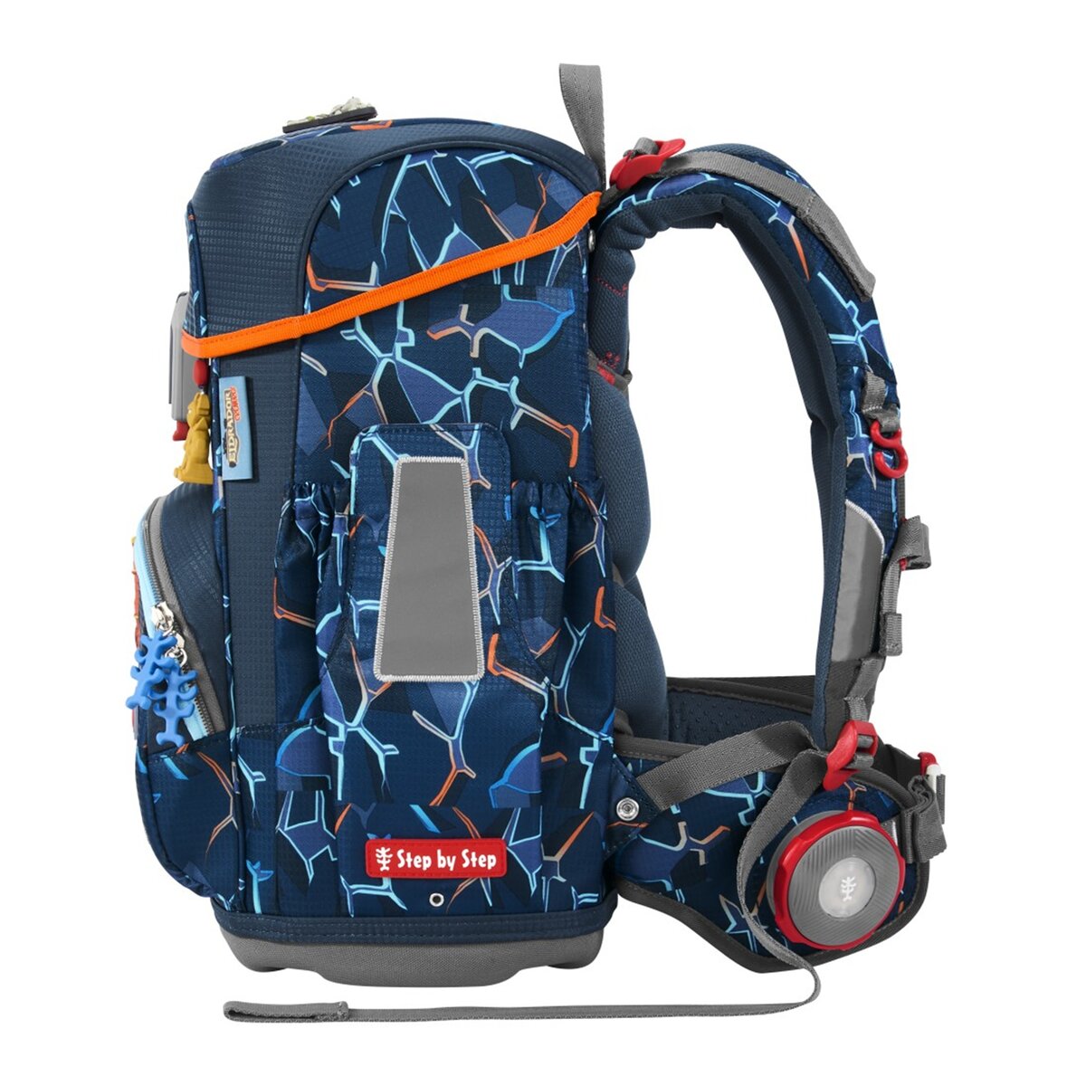 Tragekomfort/Ergonomie Ultraleichte Rückenkonstruktion aus Fieberglas Anatomisch geformte Schulterträger, höhenverstellbar (EASY GROW SYSTEM) Lageverstellriemen Höhenverstellbarer, abnehmbarer Brustgurt Abnehmbarer Hüftgurt Ergonomisch geformte Rückenpartie Atmungsaktives Rückenpolster Verstaumöglichkeiten Hauptfach mit integriertem Bücherfach Nach außen wachsende Vordertasche mit Auslaufösen Zwei offene, nach außen wachsende Seitentasche mit Auslaufösen Laschen zur Fixierung des Federmäppchens unter dem Deckel Sicherheit Reflektierende Elemente aus an Fronttasche, Seitentaschen und Schultergurten Weitere Features Leicht bedienbarer Fidlock-Magnetverschluss Aufhängungen zum Verstauen der Enden der Schulterriemen Aufhängeschlaufe Namens- und Adressfeld im Deckel Stabile, wasserdichte Bodenplatte Kleines Fach mit Schlüsselanhänger im Hauptfach Lieferumfang 1 Schulranzen 1 Federmäppchen, komplett bestückt mit Markenstiften 7 Jumbo-Markenstifte 12 Farb-Markenstifte 1 Bleistift 1 Step by Step Lineal 1 Step by Step Geodreieck 1 Step by Step Doppelspitzer 1 Radiergummi 1 Schlampermäppchen 1 Turnbeutel 1 Set MAGIC MAGS (2 Applikationen und 1 Anhänger)