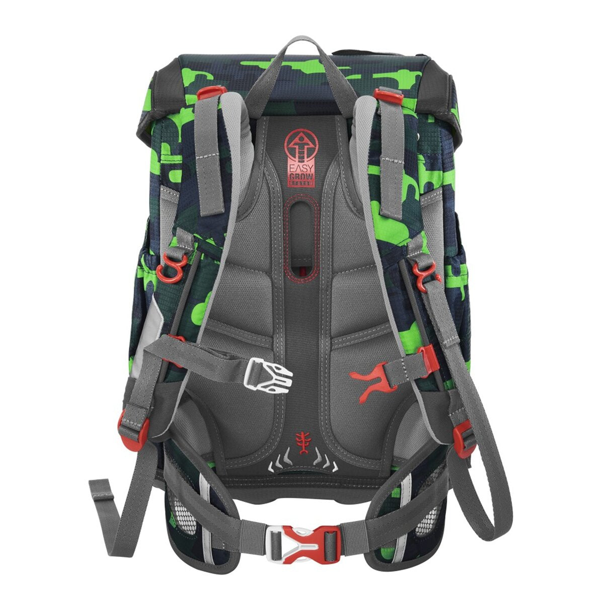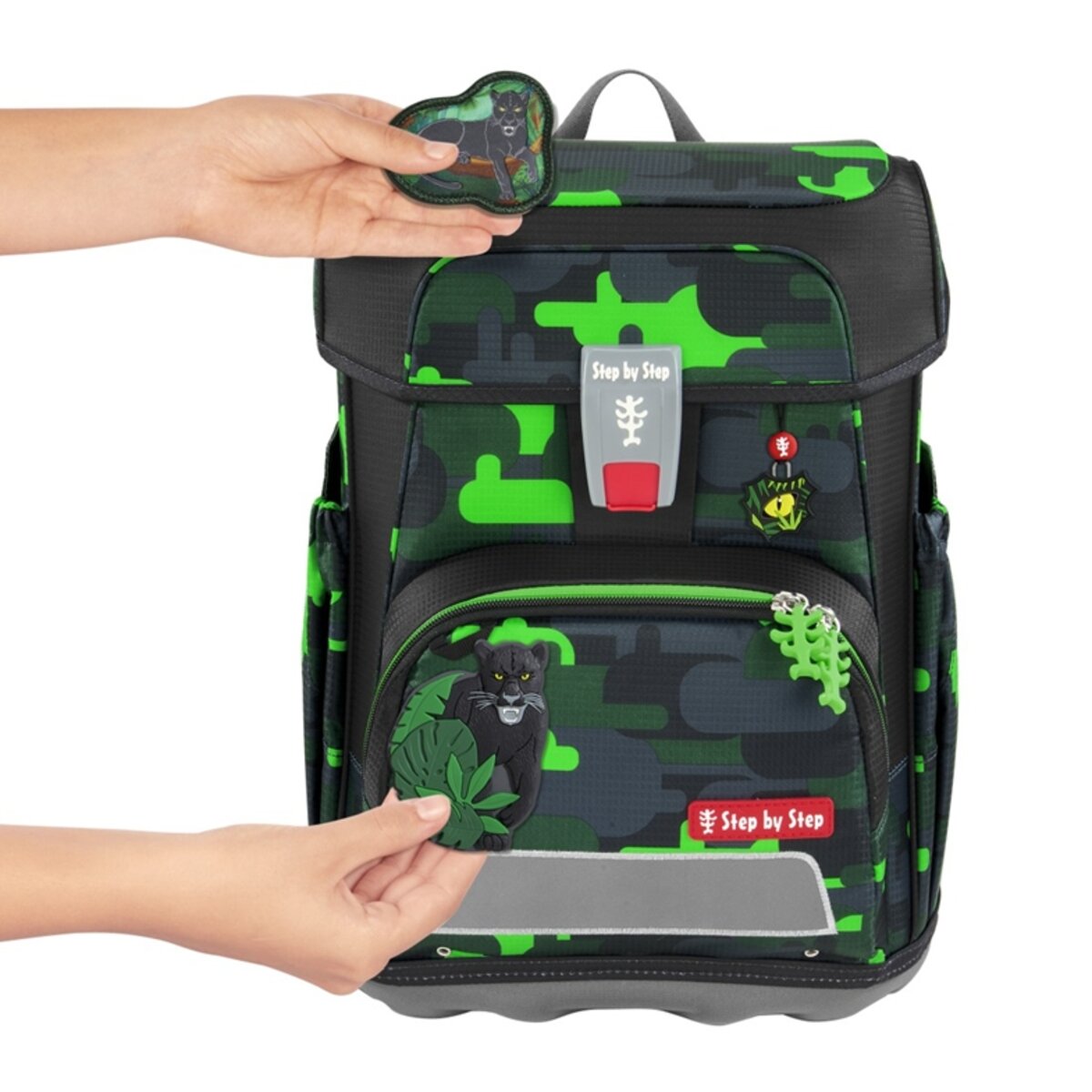 Überblick Tragekomfort/Ergonomie Ultraleichte Rückenkonstruktion aus Fieberglas Anatomisch geformte Schulterträger, höhenverstellbar (EASY GROW SYSTEM) Lageverstellriemen Höhenverstellbarer, abnehmbarer Brustgurt Abnehmbarer Hüftgurt Ergonomisch geformte Rückenpartie Atmungsaktives Rückenpolster Verstaumöglichkeiten Hauptfach mit integriertem Bücherfach Nach außen wachsende Vordertasche mit Auslaufösen Zwei offene, nach außen wachsende Seitentasche mit Auslaufösen Laschen zur Fixierung des Federmäppchens unter dem Deckel Sicherheit Reflektierende Elemente aus an Fronttasche, Seitentaschen und Schultergurten Weitere Features Leicht bedienbarer Fidlock-Magnetverschluss Aufhängungen zum Verstauen der Enden der Schulterriemen Aufhängeschlaufe Tragegriff Namens- und Adressfeld im Deckel Kleines Fach mit Schlüsselanhänger im Hauptfach Lieferumfang 1 Schulranzen 1 Federmäppchen, komplett bestückt mit Markenstiften 7 Jumbo-Markenstifte 12 Farb-Markenstifte 1 Bleistift 1 Step by Step Lineal 1 Step by Step Geodreieck 1 Step by Step Doppelspitzer 1 Radiergummi 1 Schlampermäppchen 1 Turnbeutel 1 Set MAGIC MAGS (2 Applikationen und 1 Anhänger)