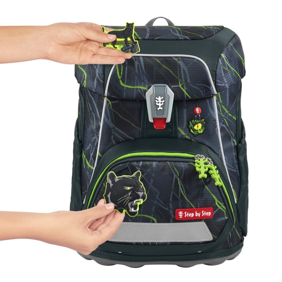 Überblick Tragekomfort/Ergonomie Ultraleichte Rückenkonstruktion aus Fieberglas Anatomisch geformte Schulterträger, höhenverstellbar (EASY GROW SYSTEM) Lageverstellriemen Höhenverstellbarer, abnehmbarer Brustgurt Gepolsterter, abnehmbarer Hüftgurt mit kleinem Seitenfach Ergonomisch geformte Rückenpartie Atmungsaktives Rückenpolster Verstaumöglichkeiten Hauptfach mit integriertem Bücherfach Nach außen wachsende Vordertasche mit Auslaufösen Zwei offene, nach außen wachsende Seitentasche mit Auslaufösen Laschen zur Fixierung des Federmäppchens unter dem Deckel Sicherheit Reflektierende Elemente an Fronttasche, Seitentaschen und Schultergurten Weitere Features Leicht bedienbarer Magnetverschluss Aufhängungen zum Verstauen der Enden der Schulterriemen Aufhängeschlaufe Schlaufen zum Befestigen, z.B. für Anhänger Namens- und Adressfeld im Deckel Kleines Fach mit Schlüsselanhänger im Hauptfach Verstecktes AirTag-Fach Lieferumfang 1 Schulranzen 1 Federmäppchen, komplett bestückt mit Markenstiften 7 Jumbo-Markenstifte 12 Farb-Markenstifte 1 Bleistift 1 Step by Step Lineal 1 Step by Step Geodreieck 1 Step by Step Doppelspitzer 1 Radiergummi 1 Schlampermäppchen 1 Turnbeutel 1 Set MAGIC MAGS (2 Applikationen und 1 Anhänger)
