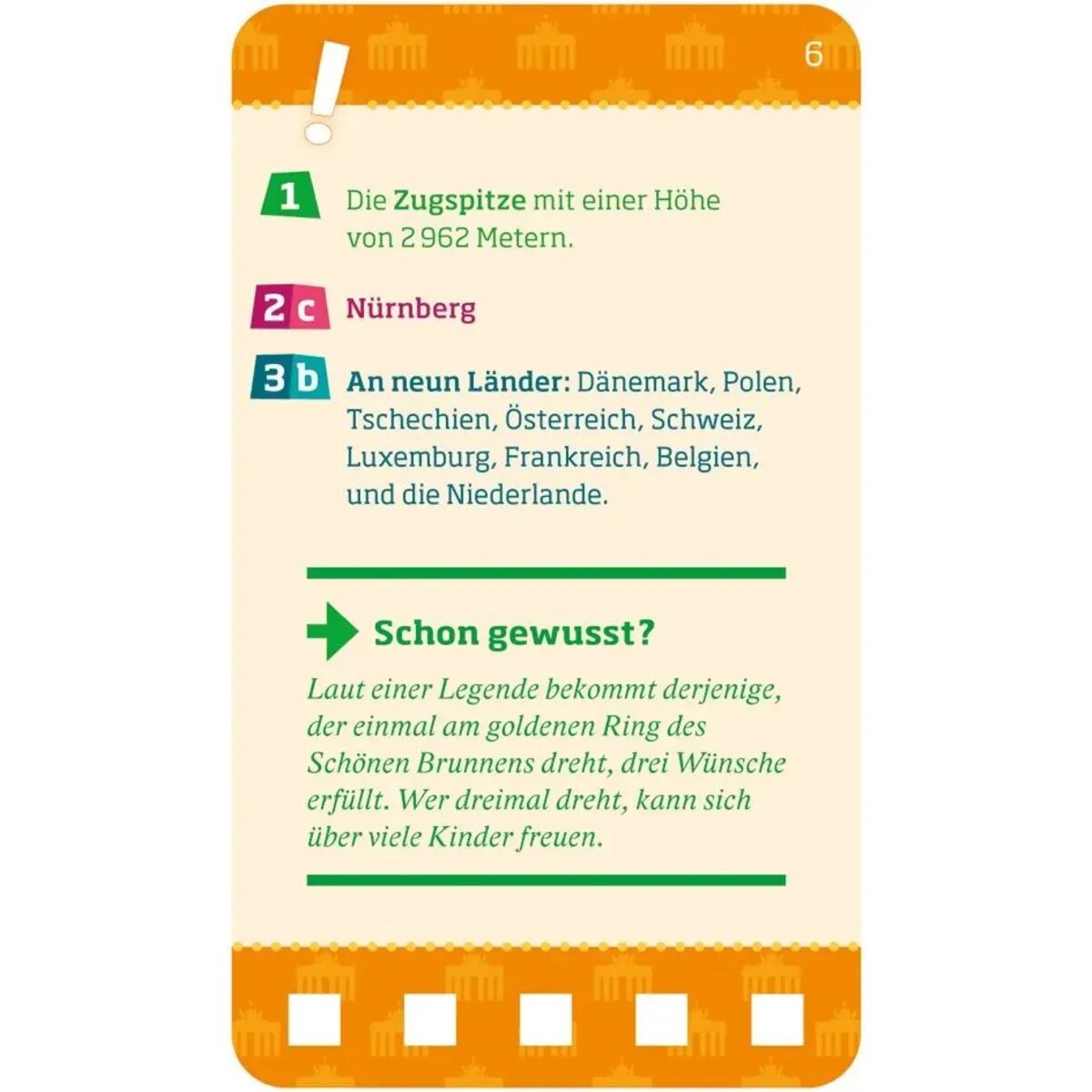 Wie viele Bundesländer hat Deutschland? Welche Länge hatte die Berliner Mauer? Und wer verfasste die deutsche Nationalhymne? 100 Fragen von leicht bis echt knifflig zu Deutschland und seiner Geschichte präsentiert dieser kurzweilige Quizblock. Ob zu Hause oder unterwegs, dank des praktischen Hosentaschenformats ist der kleine Ratespaß jederzeit griffbereit und kann allein oder zu mehreren gespielt werden. Für jede richtige Antwort gibt es einen Punkt. Perfekt für alle Ratefans, die sich einmal quer durch Deutschland quizzen wollen!