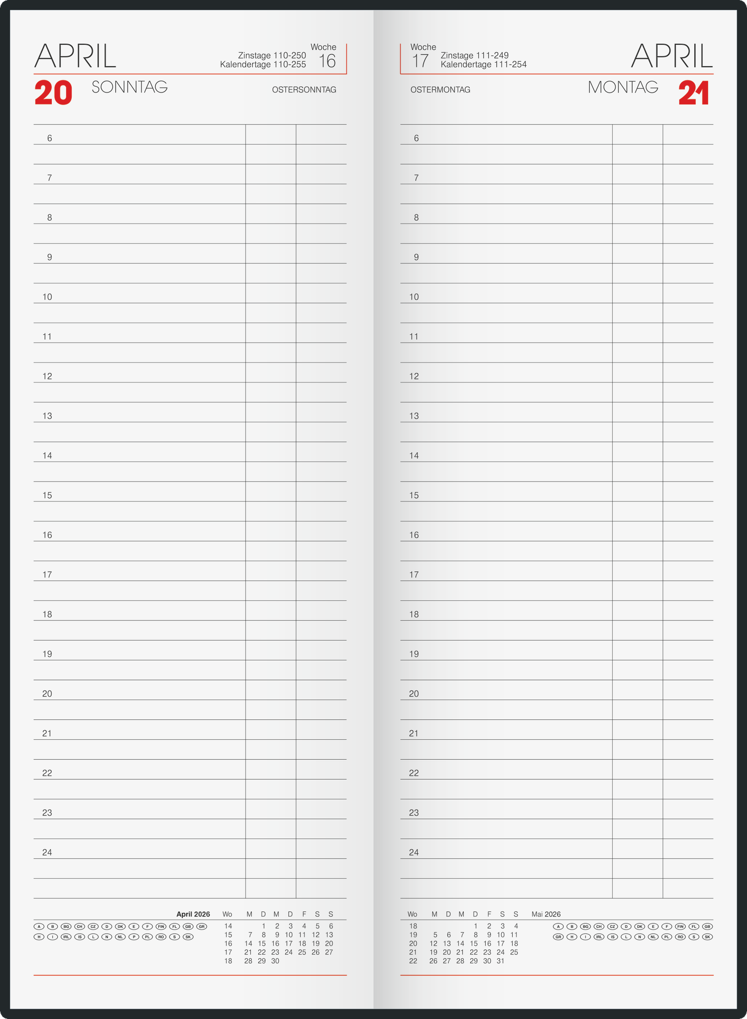 - 1 Seite = 1 Tag, Stundeneinteilung von 6-24 Uhr