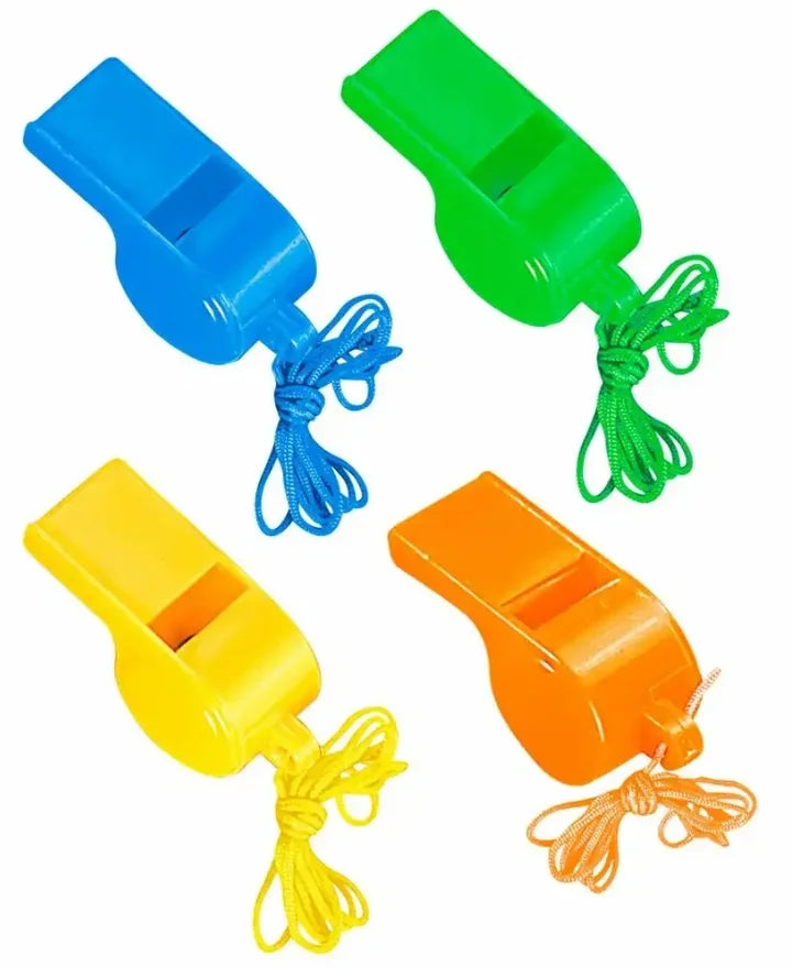 4 Stück Trillerpfeifen aus Kunststoff.
