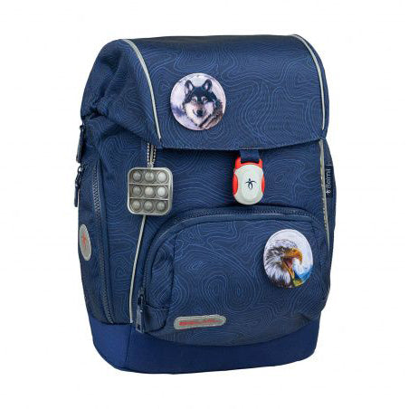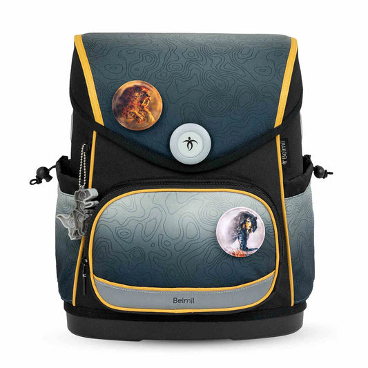 Belmil Motion ergonomisches Schulranzen Set 5-teilig "Wolves" aus recyceltem Material mit Brustgurt, Hüftgurt, Magnetverschluss, Patch Set 6 Stück